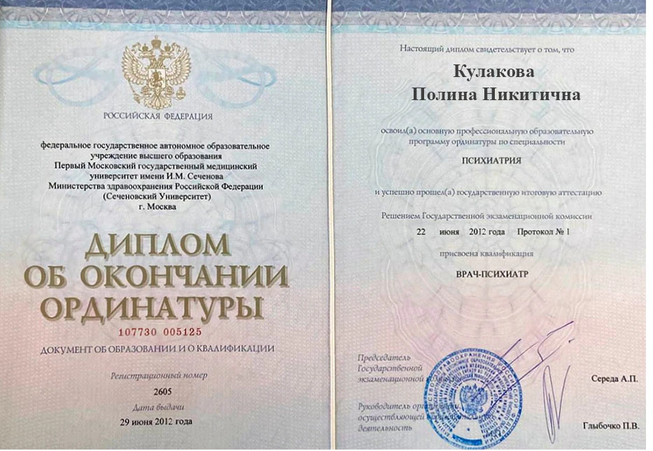 • 2012 — Первый Московский государственный медицинский университет имени И.М. Сеченова (психиатрия)