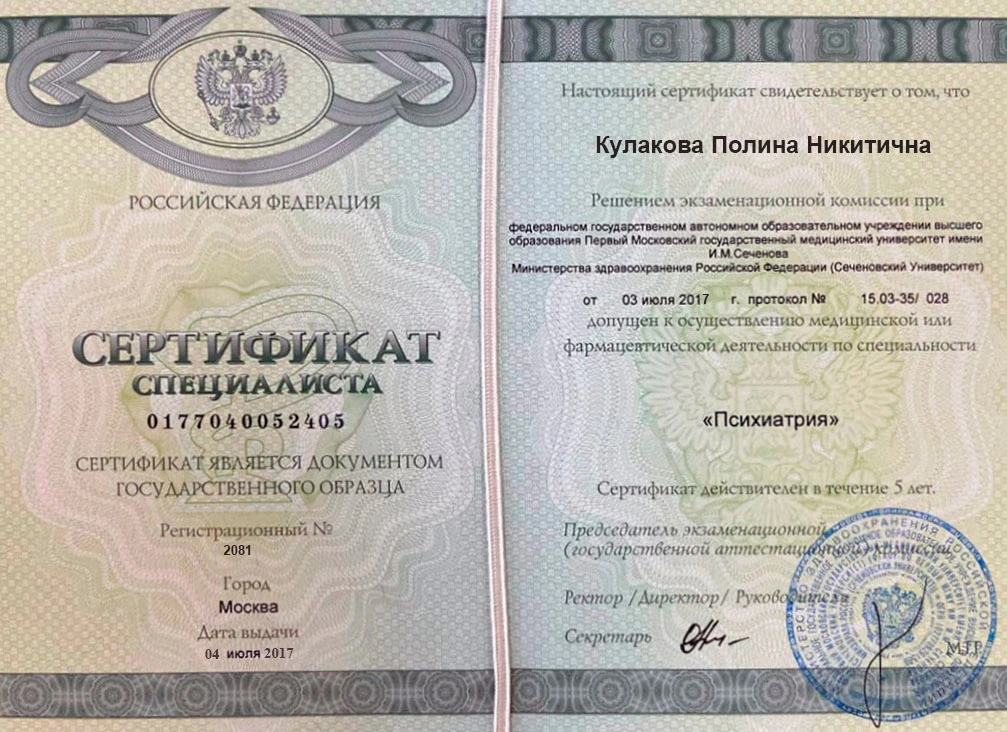 • 2017 — Первый Московский государственный медицинский университет имени И.М. Сеченова (психиатрия)