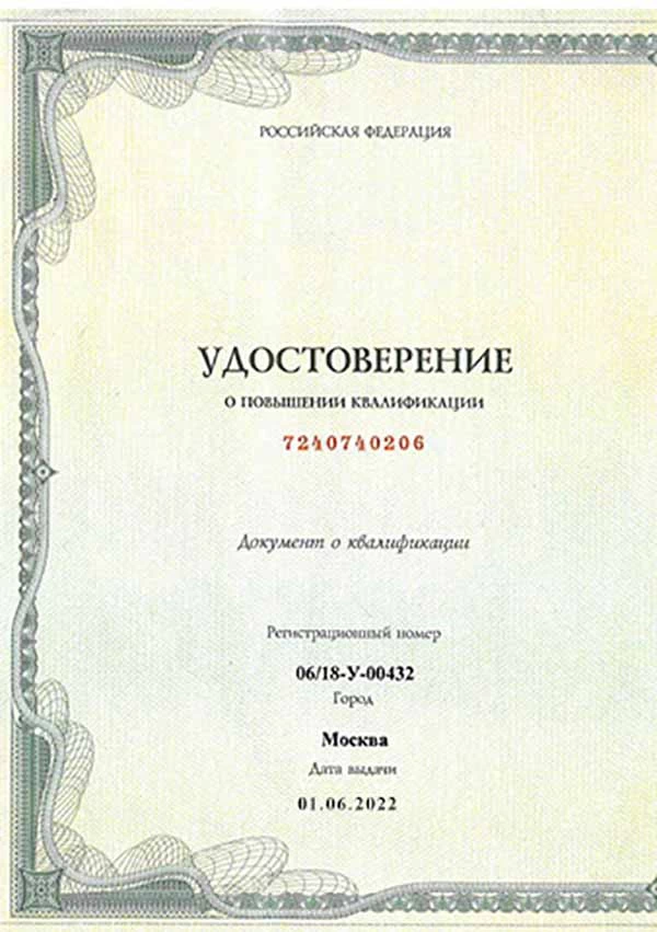 • 2022 г. — ООО «Многопрофильный Учебный Центр дополнительного профессионального образования Центр Профессиональной подготовки» (повышение квалификации по программе «Наркология»).